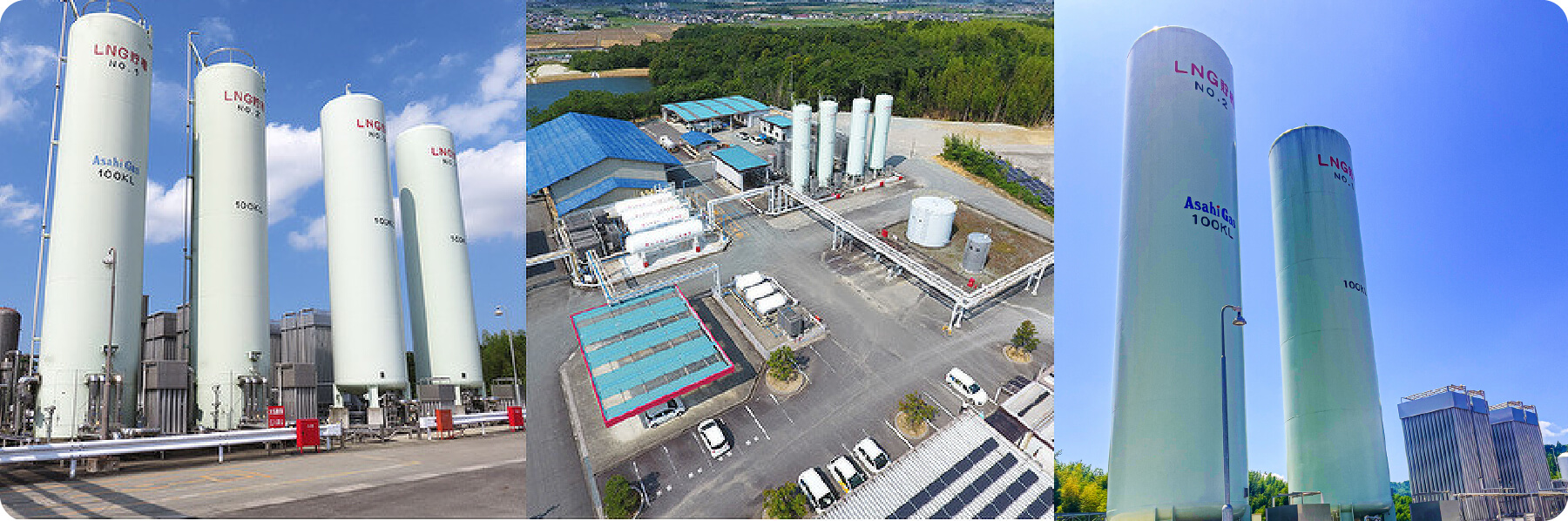 当社が導入しているガスタンクは、高さ20m・100klの容量があり、近隣の工場が使用する約1週間分のガスを蓄えています。これにより、緊急時でも事業を継続させるBCP対策に貢献。未来に備える力となります。また、タンクローリーやガスボンベの配送車両のハブ基地としての役割も果たしています。