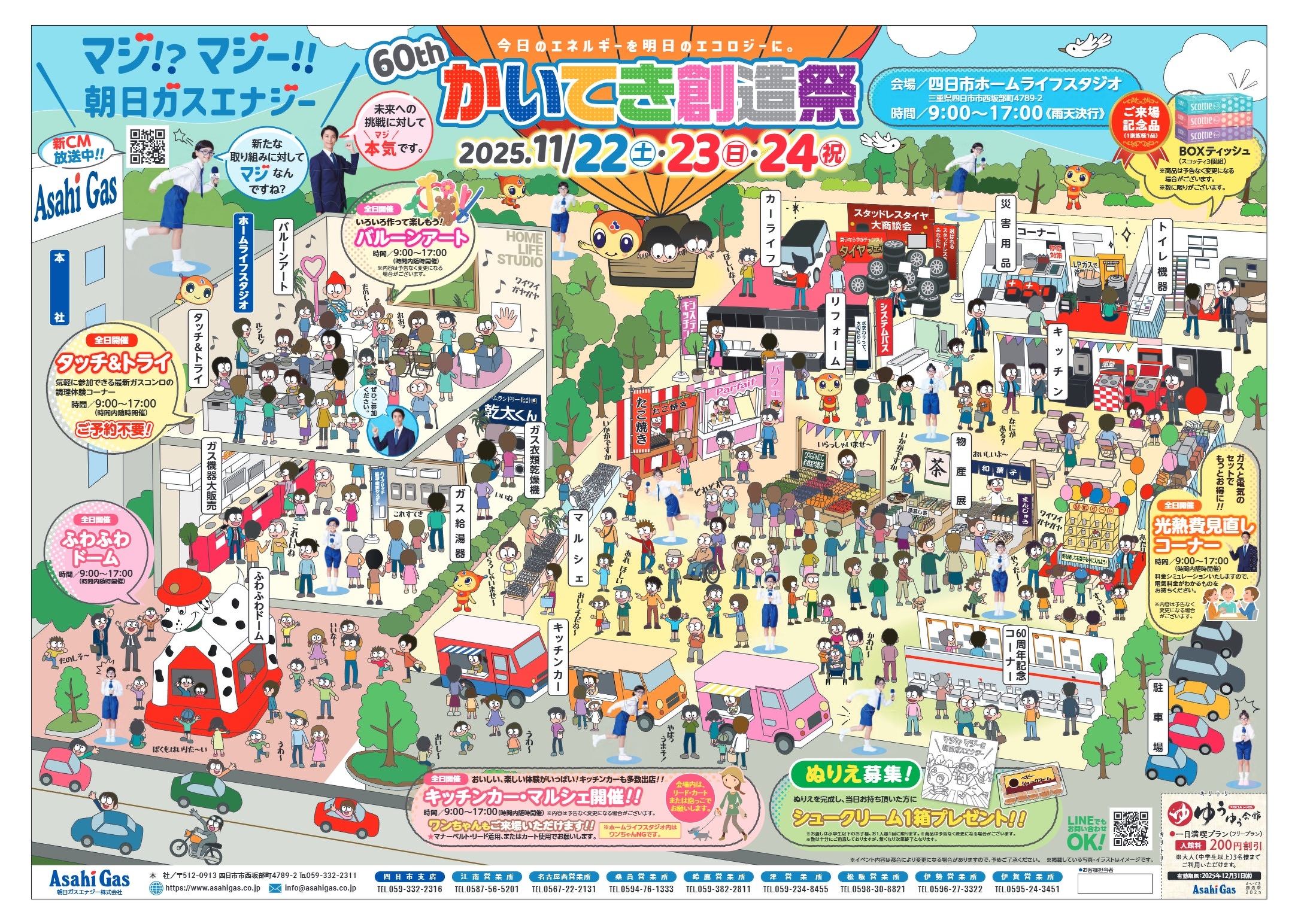 今年の「かいてき創造祭」はなんと60周年のスペシャルバージョン! 四日市本社会場にてパワーアップした1会場開催でお届けします! 開催日 11/22(土)~24(月・祝) 四日市本社会場 マジで楽しい! ・地元の魅力がギュッと詰まったマルシェ。 ・お腹も心も満たされるキッチンカー そしてもちろんガス機器などの大特価販売をご用意しております。 感謝の気持ちを込めて、皆さまに「快適」を創造する特別な3日間。 ご家族・ご友人と一緒に、ぜひ遊びにきてください!。