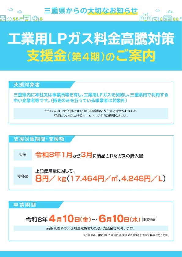 三重県より、「工業用LPガス負担軽減支援事業(第4期)」の募集が4月10日(金)より開始されると発表されました。