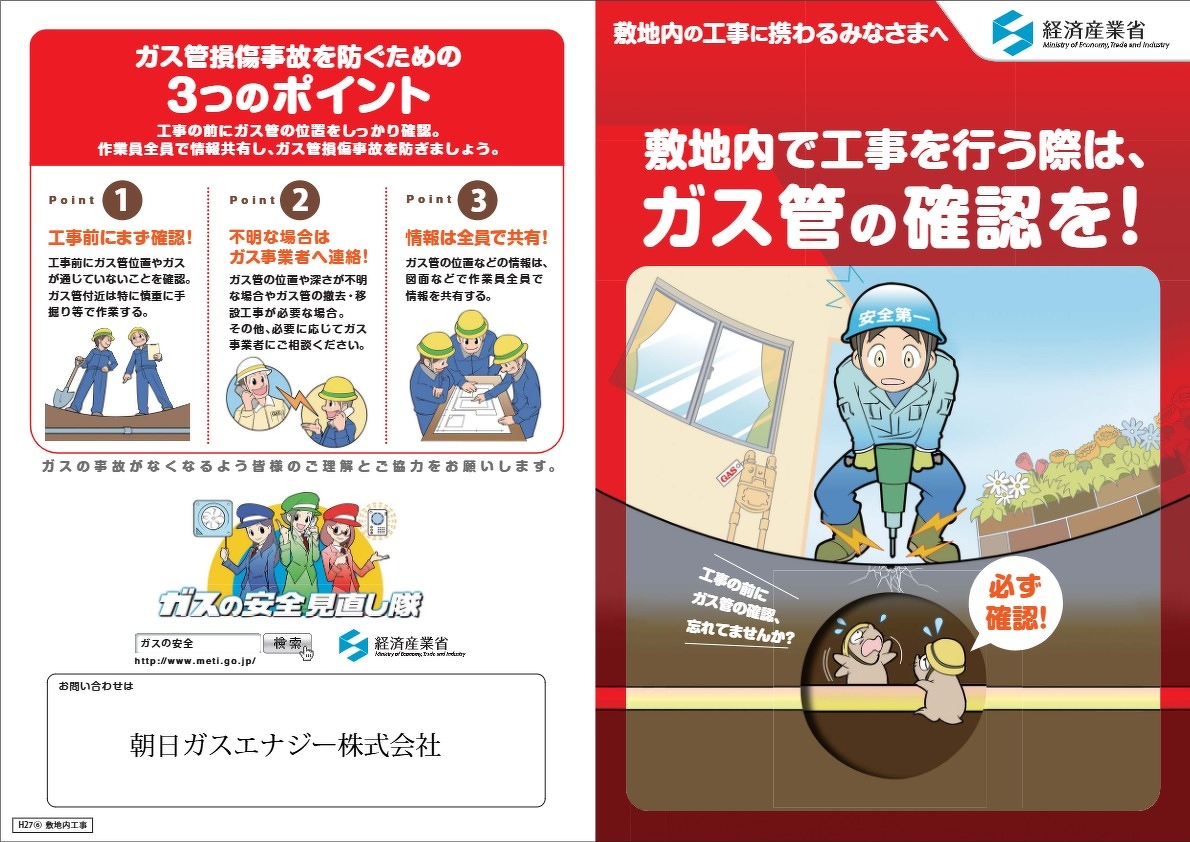 当社がガスを供給する敷地内・建物内で工事を行う際には、誤ってガス管を損傷しないように事前に当社へお問い合わせください。