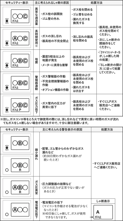 - 【必ず行う】マイコンメーターのセキュリティー表示を確認して、しゃ断原因を調べてください。しゃ断弁開操作を行う場合はメーター復帰方法をご覧ください。