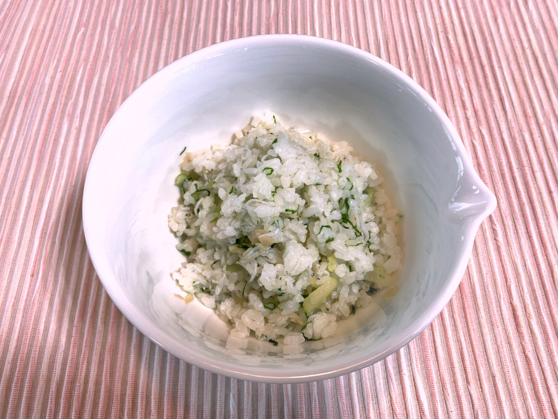 ボウルにオリーブ油、塩を入れよく混ぜたら、②、③としらすを加え、和えます。 - ①のご飯に④を混ぜたら完成です。
